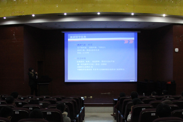 2013年11月28日晚,澳大利亚名校留学指导讲座(本升硕)在逸夫楼学术报告厅举行,讲座由澳大利亚教育管理集团学生服务部田媛媛老师主讲。